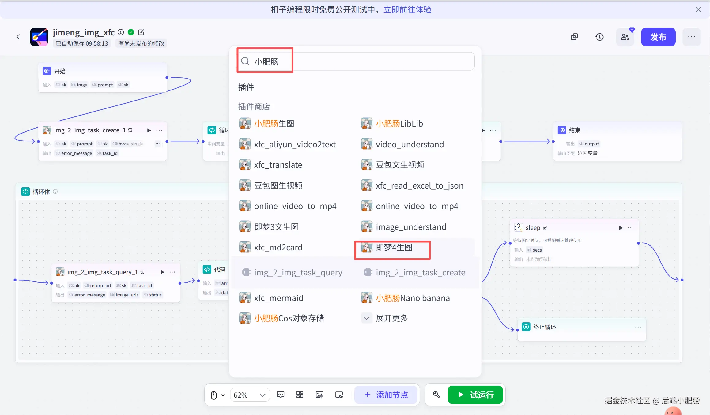 在上图中img_2_img_task_create和img_2_img_task_query是我开发的即梦四生图插件,在工作流界面点击【添加节点】搜索小肥肠,即可使用: