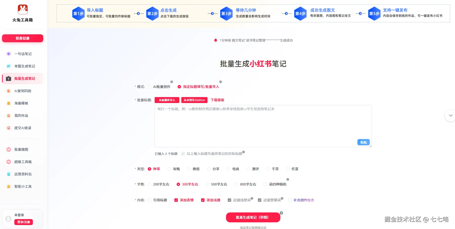 这些技巧能落地,全靠我一直在用的火兔工具箱。火兔工具箱作为全能内容创作助手,完美适配上面说的一站式创作需求,不管是批量生成笔记,还是精准采集爆款素材,都能轻松搞定。之前我尝试用它做母婴赛道的笔记,一次性导入8个选题,20分钟就生成了6篇初稿,后续只花了1小时微调,当天就完成了3天的更新量,效率直接拉满。
