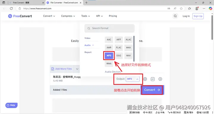 Step2:在添加文件后,选择文件转换格式为“MP3”,接着点击开始转换。