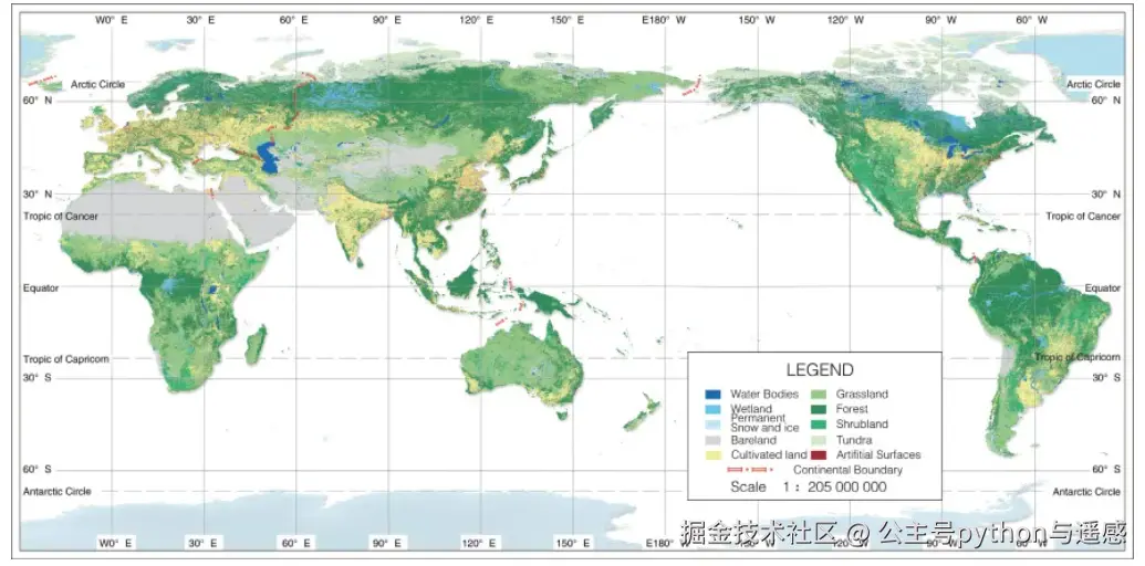 GlobeLand30数据集包含十个主要的地表覆盖类型,分别是耕地、森林、草地、灌木地、湿地、水体、苔原、人造地表、裸地、冰川和永久积雪。该数据集的空间分辨率为30米,意味着每个像素代表地面约30米×30米的区域,适用于中大尺度地表覆盖分析。数据采用WGS-84坐标系,南纬85°-北纬85°之间的区域采用UTM投影,6度分带,坐标单位为米,坐标不加带号;南北纬85°-90°之间的区域采用极地方位投影。