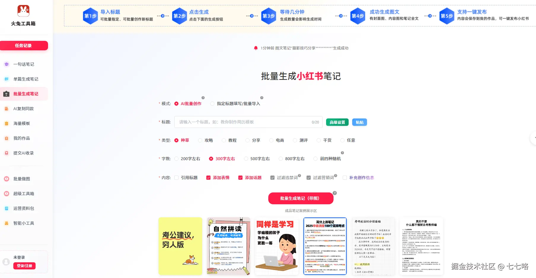 比如上次追“秋季穿搭”热点,我用采集到的爆款素材,通过火兔工具箱生成了5篇不同风格的笔记,有通勤风、休闲风、学生党风,覆盖了不同人群,而且每篇内容都有自己的特色,不会重复。生成完之后,还能用火兔工具箱的内容违禁词检测功能检查一遍,避免因为违禁词导致内容限流,这一步真的能省不少后期修改的时间。