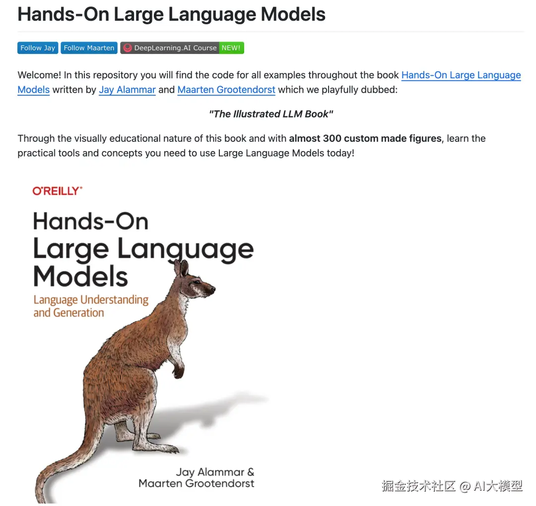 它来自同名书籍《Hands-On Large Language Models》,并附带一整套可运行的 Jupyter Notebook 实例。 通过这些示例,你可以一步步学会: