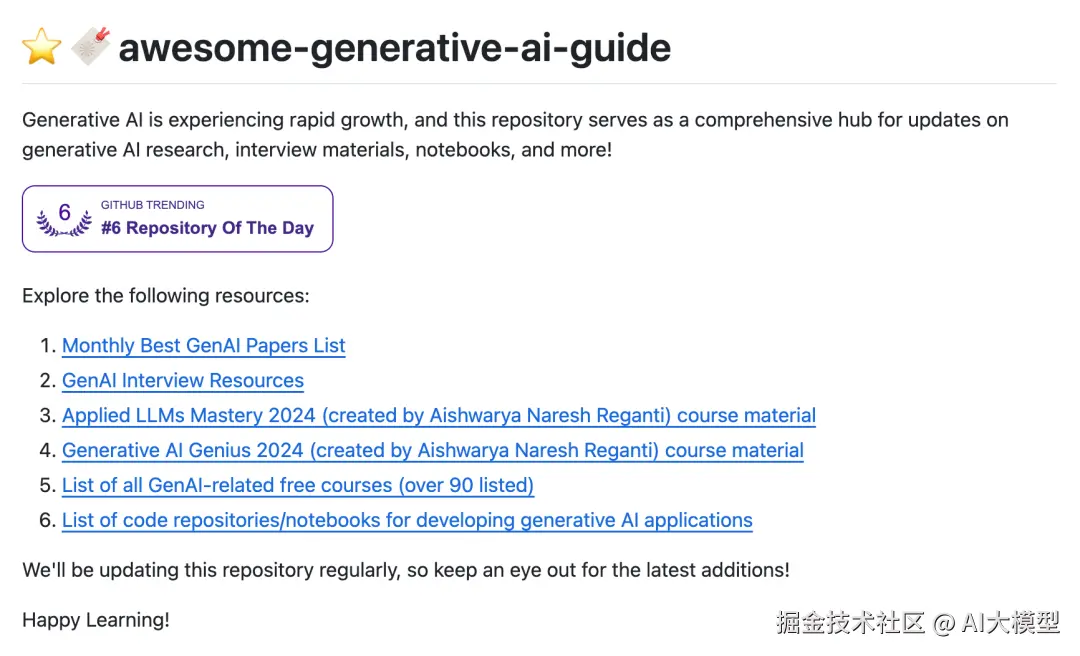 Awesome Generative AI Guide 是一个精心整理的学习资源合集,几乎涵盖了整个 GenAI 方方面面: 从文字生成、图像生成,到研究论文、开源项目、实战案例……应有尽有。