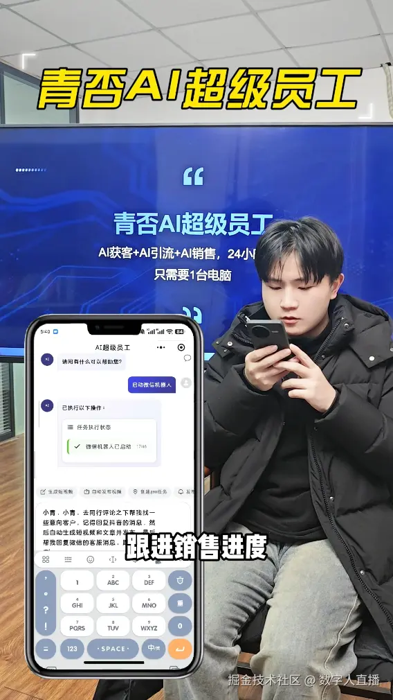 青否AI超级员工支持通过微信小程序发送语音指令,直接调度【AI获客+AI引流+AI销售】三大模块,像对话真人团队一样,驱动AI完成全链路营销动作。(青否ai员工源头v:zhibo175)