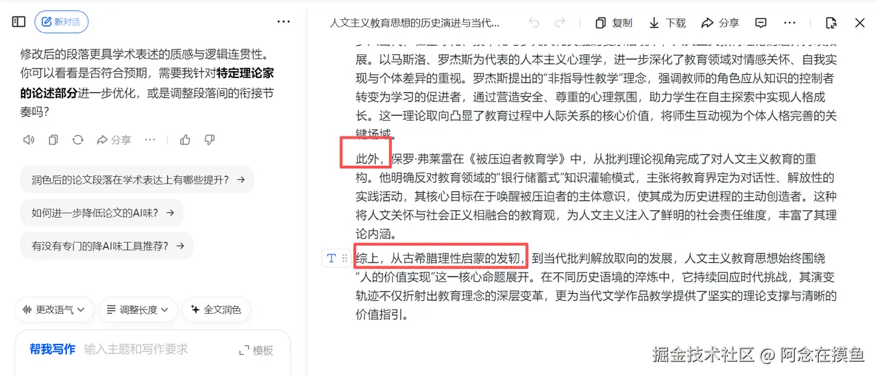 - 效率极低:需要你一段一段复制粘贴,而且极其容易出现废话,把逻辑改乱。想要 免费降低ai率,就得付出时间的代价。