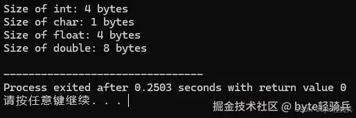 sizeof 被用来计算基本数据类型 int, char, float, 和 double 的大小,并将结果打印出来。