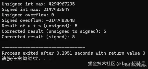 对于无符号数,溢出会导致结果从最大值回绕到0。