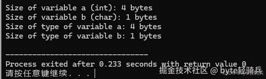 sizeof 被用来计算变量 a 和 b 的大小,分别是 int 类型和 char 类型。注意,sizeof(a) 和 sizeof(int) 返回的是相同的结果。