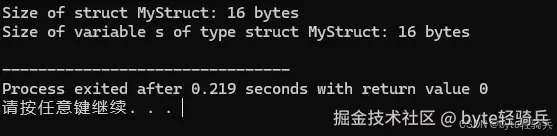 sizeof 被用来计算结构体 MyStruct 的大小。注意,结构体的大小可能会因为内存对齐(padding)而大于其成员大小的总和。