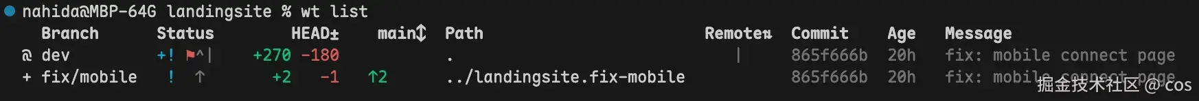 | 列出所有 worktree 状态 | wt list | git worktree list (只显示路径) |