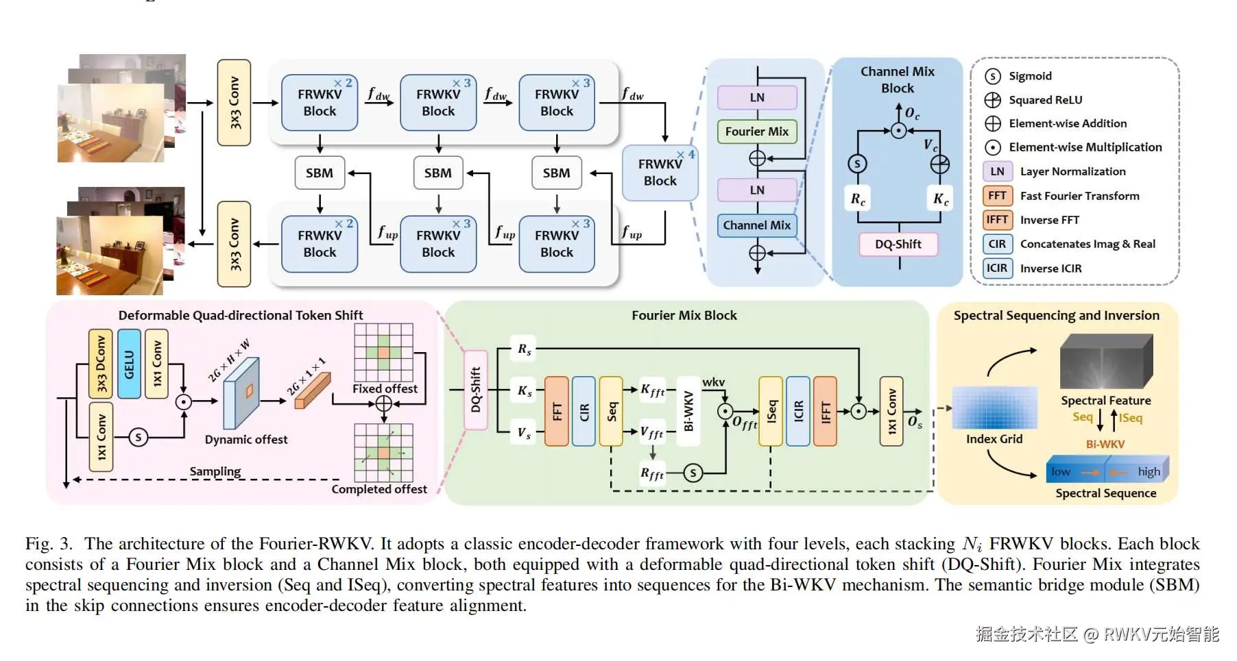 Fourier-RWKV 通过将 WKV 注意力机制扩展至频域来解决图像去雾问题。该模型融合了空间、频域与语义三种感知状态,以线性复杂度实现了 SOTA 性能,有效平衡了恢复质量与计算效率。
