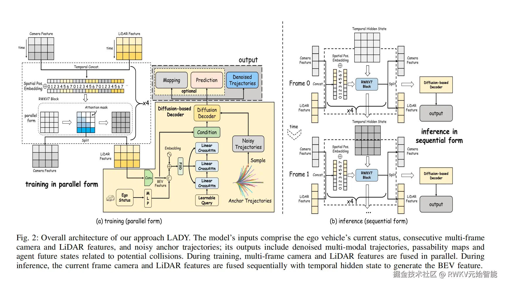 该研究基于 RWKV-7 模型提出首个完全线性注意力的端到端自动驾驶框架 LADY。它通过轻量级线性交叉注意力机制,高效融合多帧传感器数据,实现恒定计算与内存开销。实验证明 LADY 在提升规划性能的同时显著降低计算成本,并已在边缘设备部署验证。