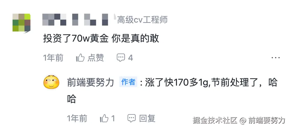 - 黄金大赚,我400多1g买的,因为之前缺钱,600多卖掉的,因为此事,我老婆骂了我好久。没办法,,,我不喜欢借钱,不喜欢欠人情,所以卖掉周转,白干一场,本金也没了。。。