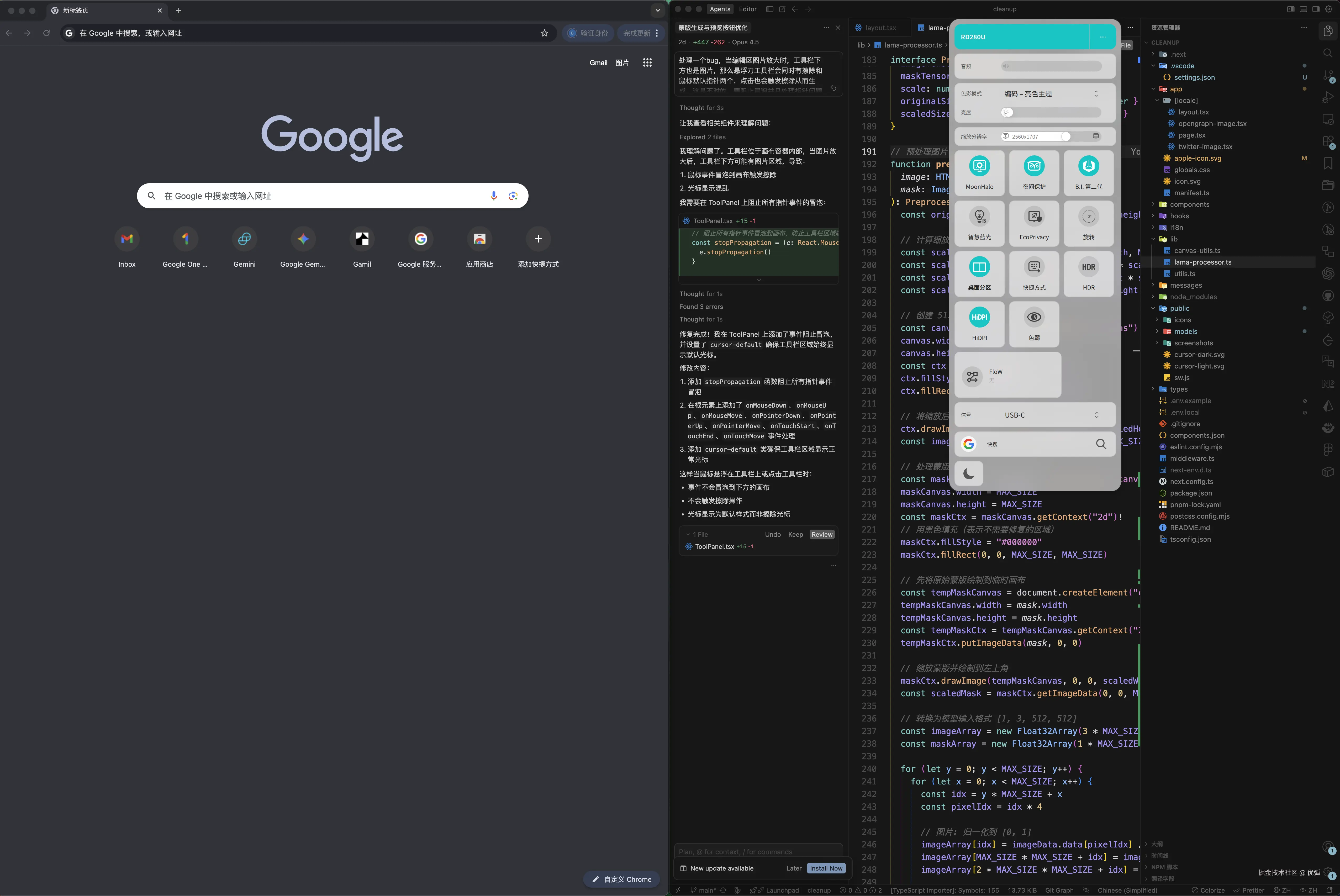 RD280U 是 28.2英寸,3840×2560,3:2。 单看参数不刺激,但实际写代码的时候非常直观:同一屏能看到更多代码行,尤其适合“左中右三栏 + 底部终端”的AI编程布局。
