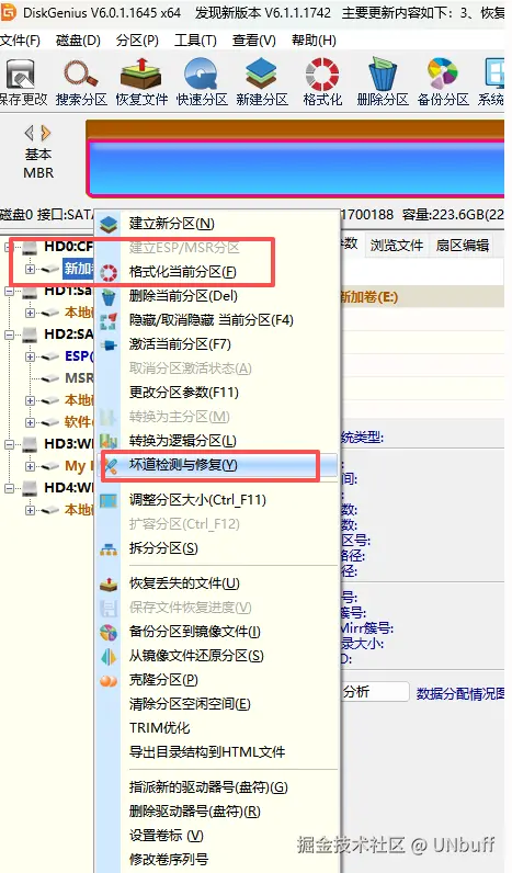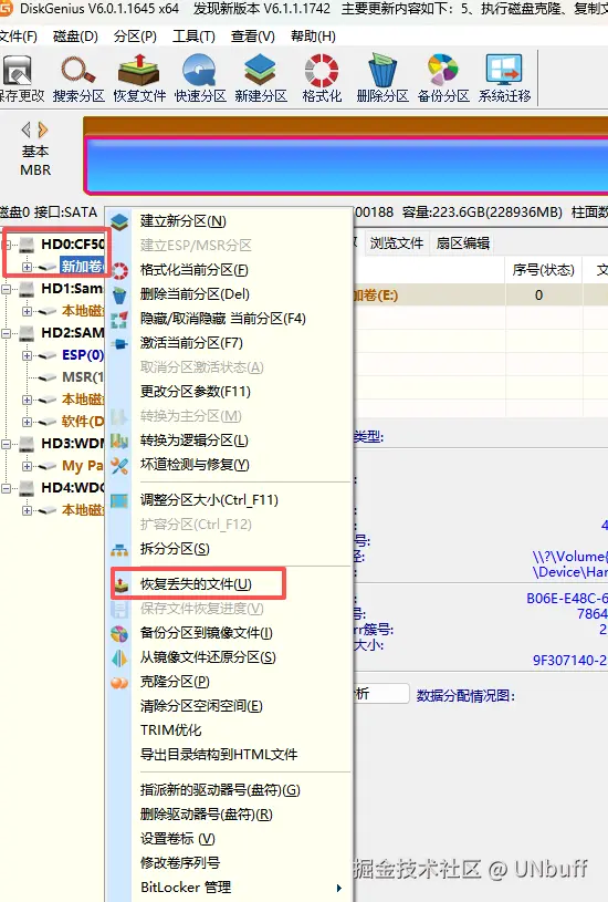 您要恢复的数据存在于哪个分区或者盘位上,那么直接在DiskGenius主界面上方的硬盘分区,点击鼠标右键,然后在弹出的快捷菜单中,选择菜单项“恢复丢失的文件”