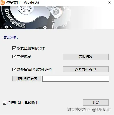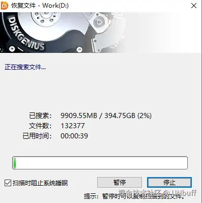 设置好恢复选项,点击“开始”按钮后,DiskGenius软件就开始扫描硬盘或分区中的数据了,首先会弹出一个扫描窗口