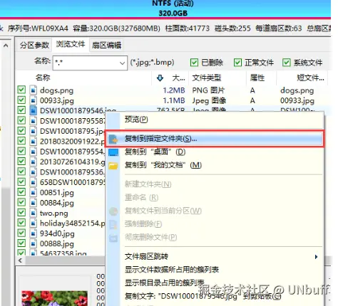 恢复硬盘数据的最后一步就是把软件搜索到的文件复制保存到其他安全地位置。勾选想要恢复的文件,右击鼠标,然后选择“复制到指定文件夹”菜单项。之后,自己选择个位置来存放恢复的数据即可。