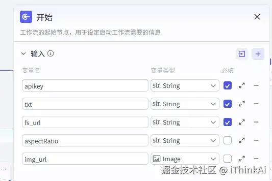 设置变量参数表单,含fs_url(飞书多模表格链接)、apikey(登录www.ac\[1\] - ai.cn申请获 取)、txt(要生成内容的【主题】或【主题 + 文字内容】)、aspectRatio(图片比 例)、img_url(参考图)。