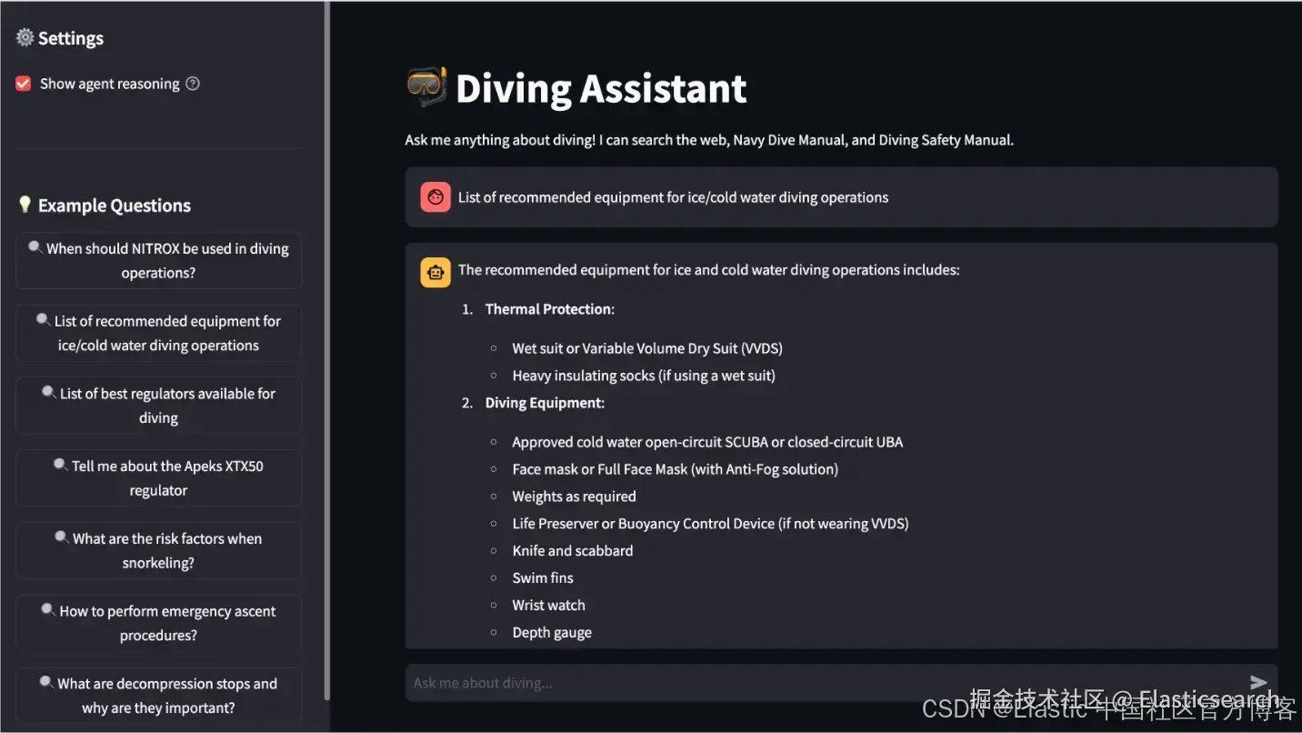 目标是让这个 Diving Assistant 成为潜水相关知识的一站式工具,能够回答任何查询,即使是超出已导入知识库范围的问题。 LLM 会识别用户查询背后的动机,并选择最可能相关的信息源。我决定使用 LangChain 作为 agentic 包装器,并在其上构建了一个 streamlit UI。