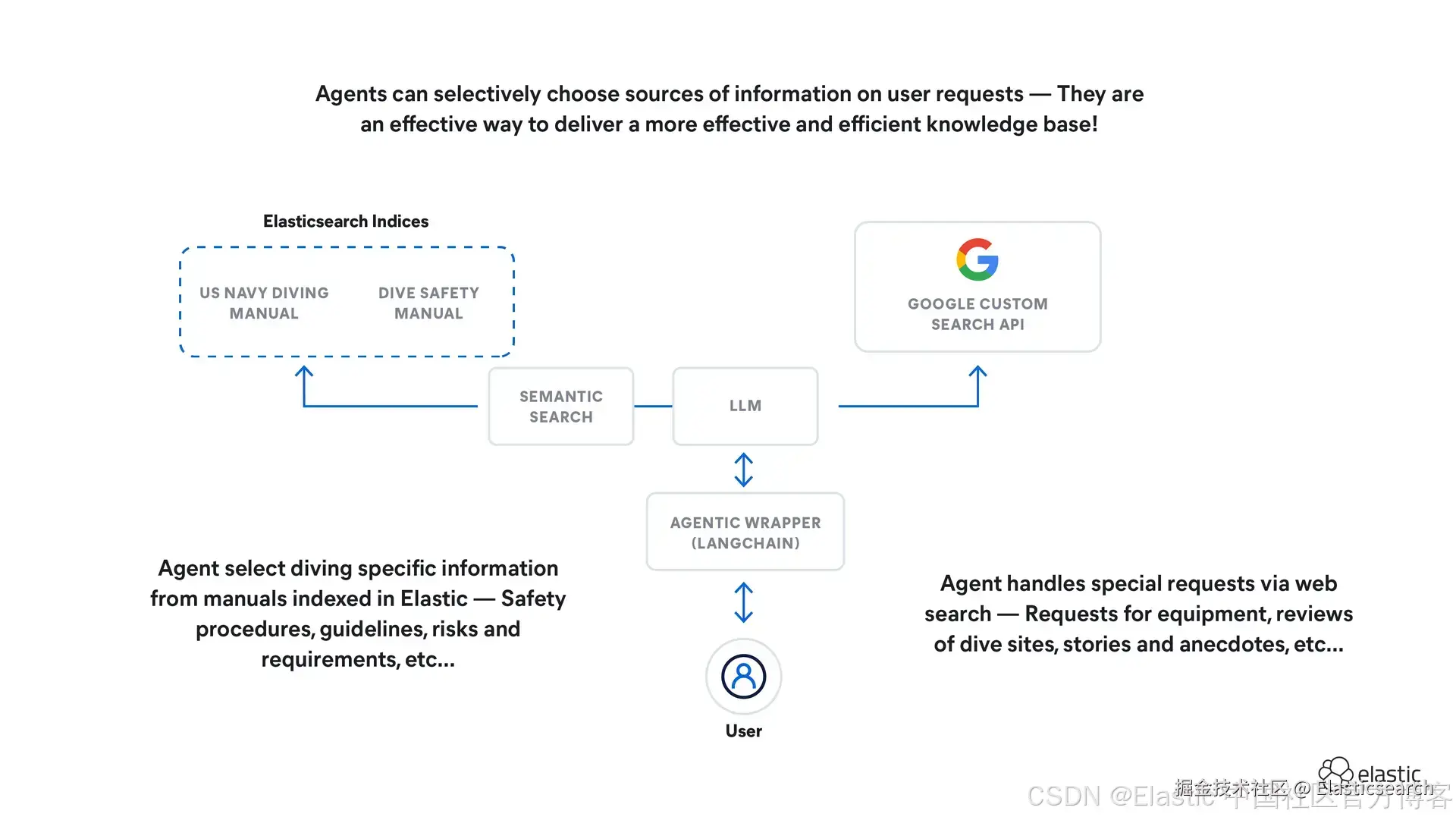Agentic 模型的核心在于 LLM 能够根据用户输入采取特定的行动。这些行动可能涉及使用工具来增强 LLM 现有的能力。从这个意义上说, RAG 充当一个长期记忆存储, LLM agent 可以选择使用它来增强和强化对用户查询的回答。传统的 RAG 模型是由 LLM 查询一个或多个知识库,而 agentic 实现则允许 LLM 从一组知识库中进行选择。这使问答行为更加灵活,并且可以提高准确性,因为无关知识库中的信息会被省略,从而减少潜在的噪声来源。我们可以将这样的系统称为 “ agent 知识库 ”。下面我们来看看如何使用 Elasticsearch 实现这样一个系统。