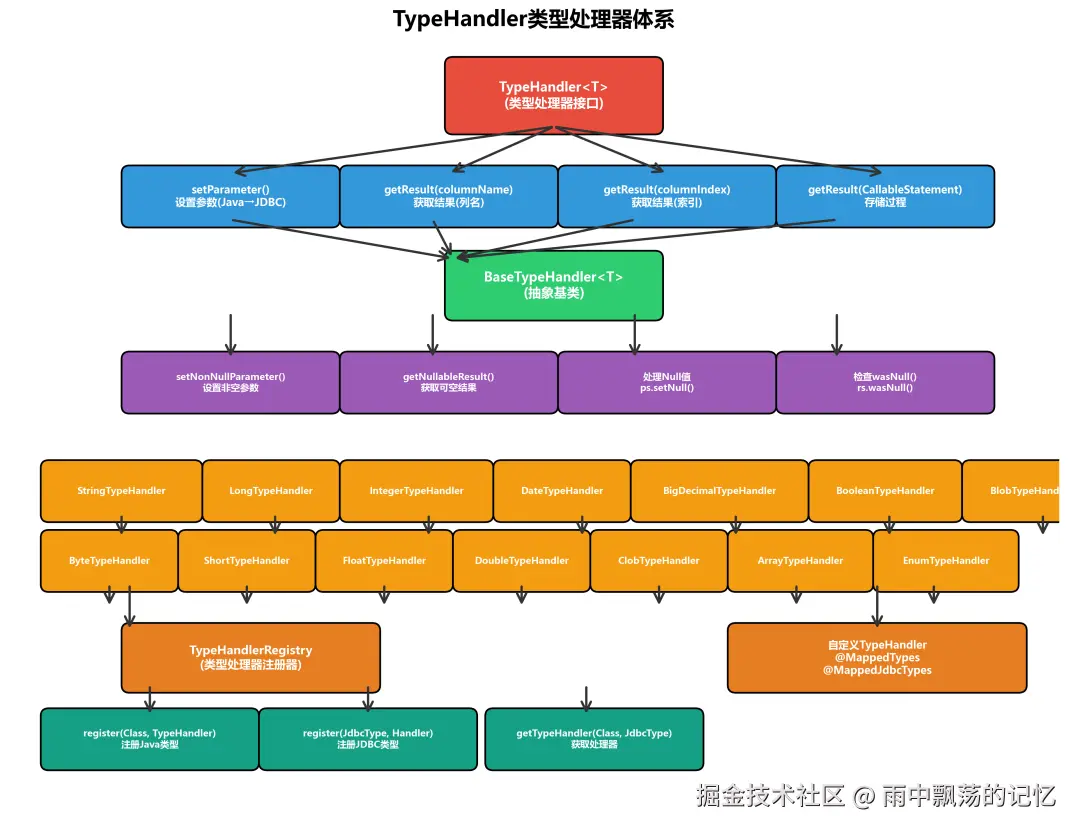 从架构图可以看出,MyBatis采用了分层架构设计,而类型处理模块(TypeHandler)位于基础支撑层,是连接Java类型与JDBC类型的桥梁。它负责在SQL执行过程中,将Java对象参数转换为JDBC能够识别的参数类型,以及将ResultSet中的数据转换为Java对象。