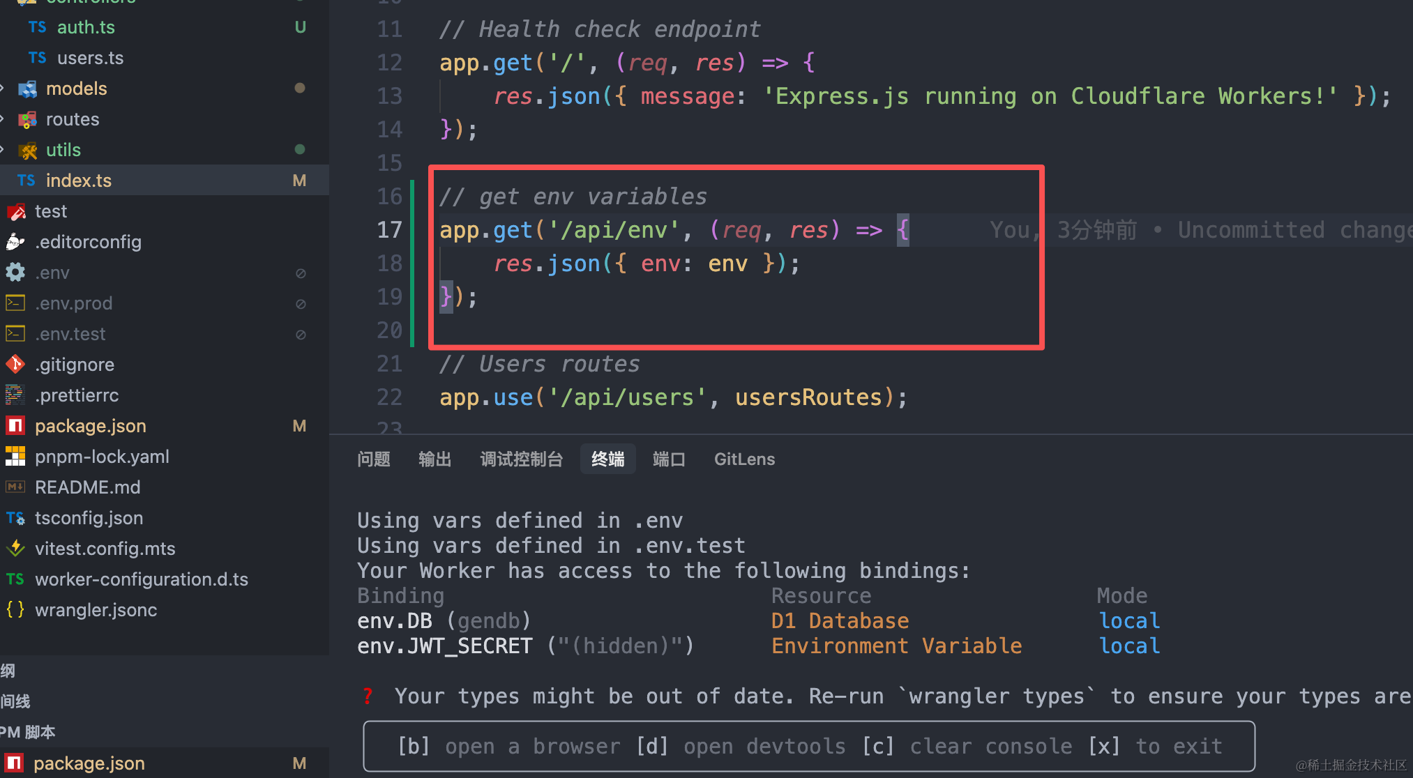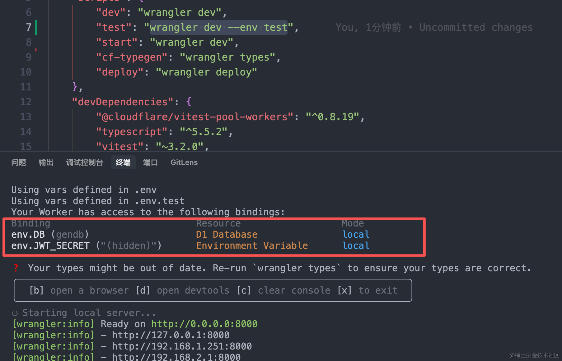 或者在wrangler.jsonc同级目录配置.env文件:注意.env文件不应该被git记录