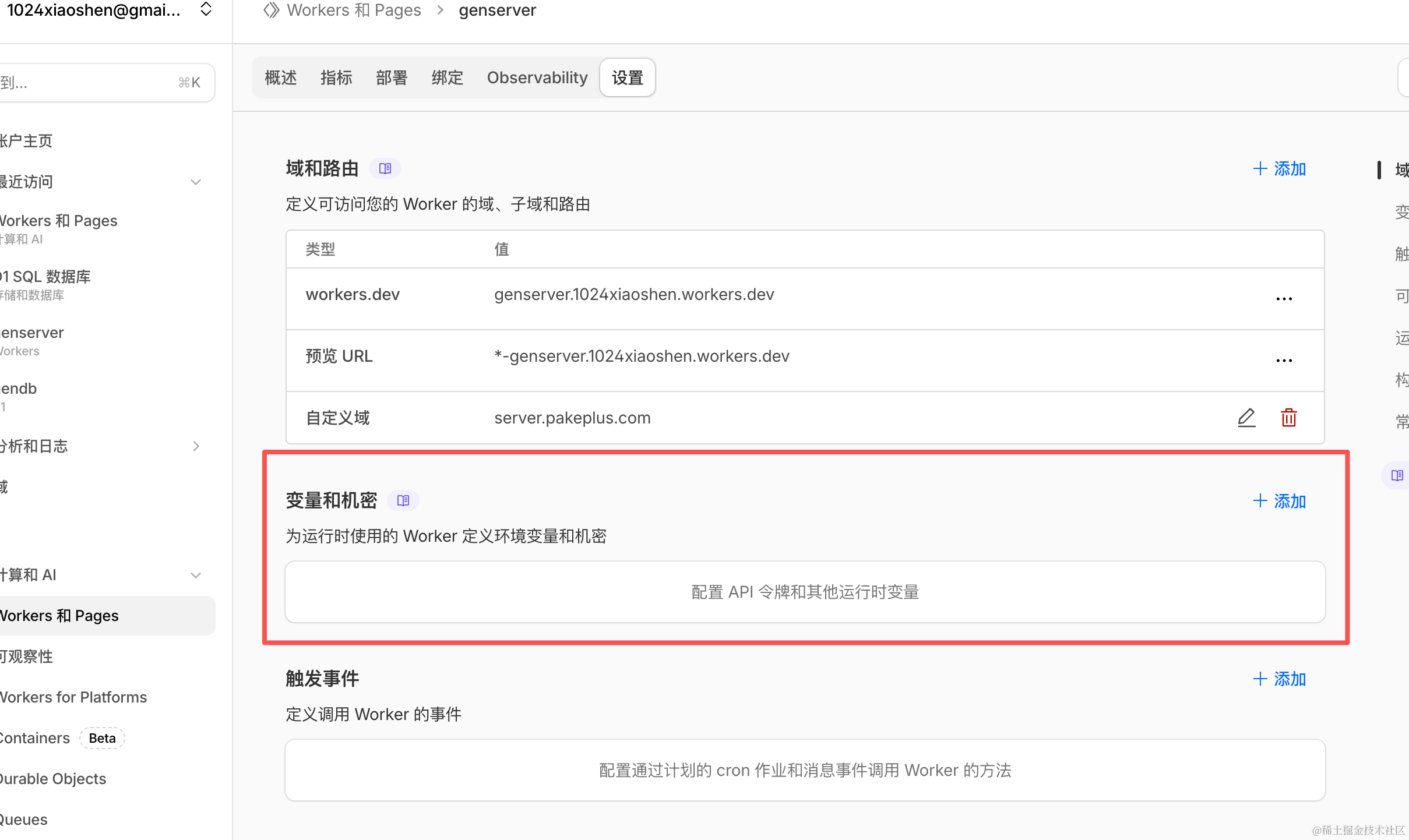 当然wrangler.jsonc定义的是配置会被git同步到仓库中,肯定是不安全的,所以这里配置的一定是不重要的或测试环境的变量,在后台worker中可以配置生产环境的变量: