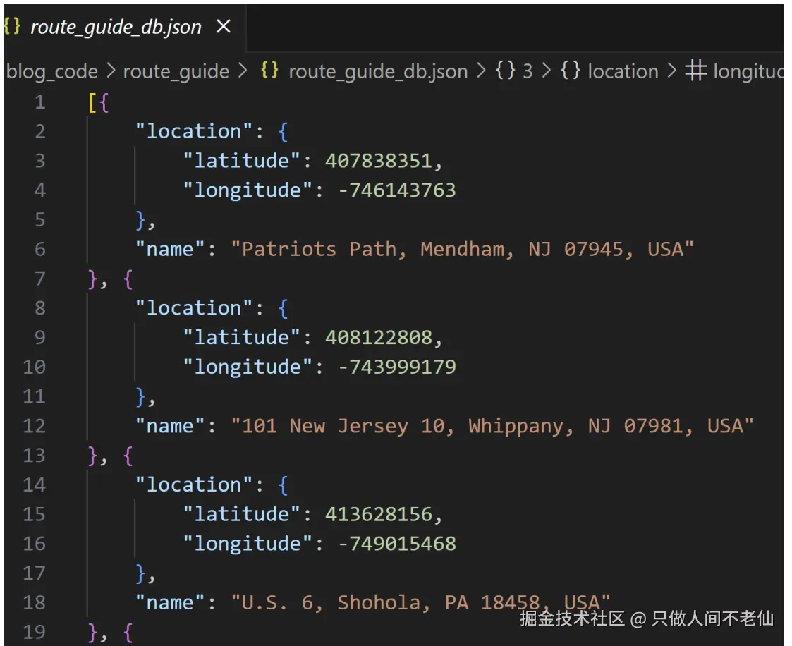 被解析的json文件路径:route_guide/route_guide_db.json。这其实就是一个json形式的Feature信息列表,代表一些城市的E7表示法经纬度信息,可以看message Point的注释。部分数据如下:
