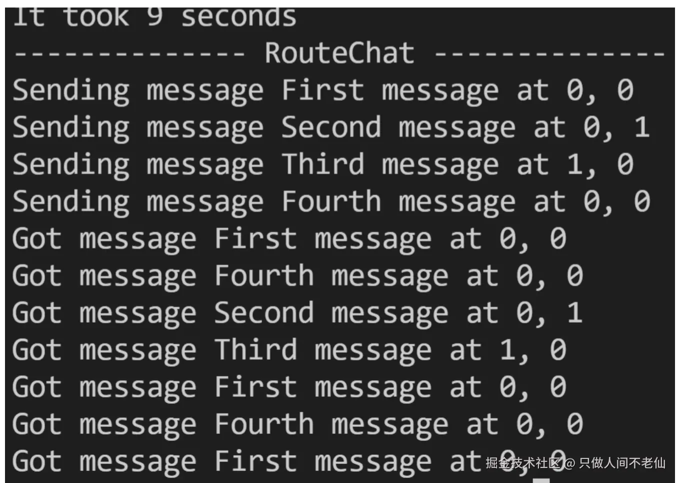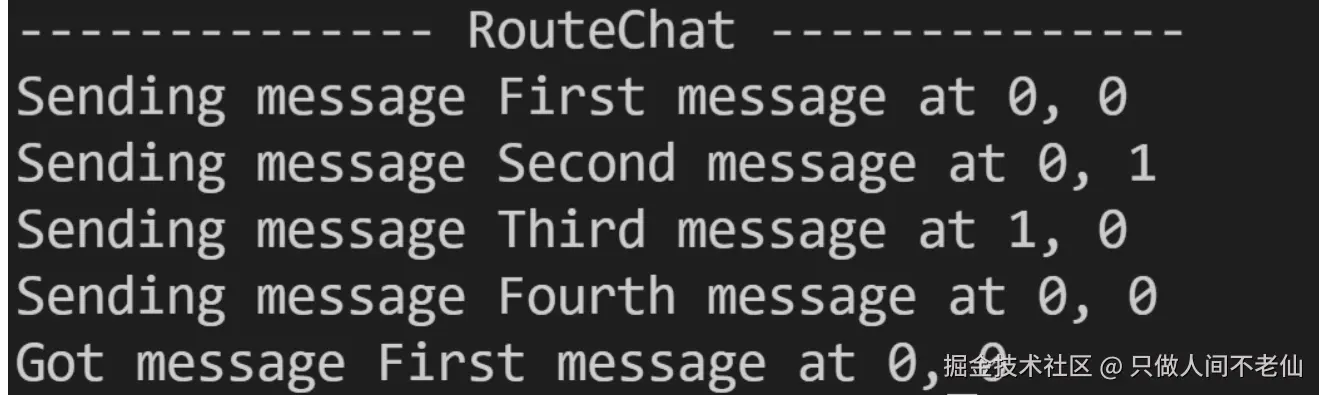 功能介绍:客户端向服务器发送点位以及点位上的附加信息,服务器首先遍历当前接收过的所有信息,把属于同一个点位的信息返回给客户端,然后把客户端传过来的信息记录下来。在这个示例中,客户端发送信息是额外起一个线程去做的,连续发送了4条信息,其中前三条信息,因为点位各不相同,所以没有信息返回,而第4条信息因为点位和第一条信息相同,所以服务器会返回第一条信息。如果我们在不停止服务器的情况下,连续两次运行客户端,可以得到如下输出。可以发现,因为第一轮运行的时候,已经在点位(0,0) 写入First和Fourth两条信息,所以在第二轮运行再次向点位(0,0) 发送First信息的时候,对应会有两条信息从服务器返回,其他的依次类推。同样我们可以抓包分析这些信息客户端和服务器均为多次流式发送的,这里不再展开。