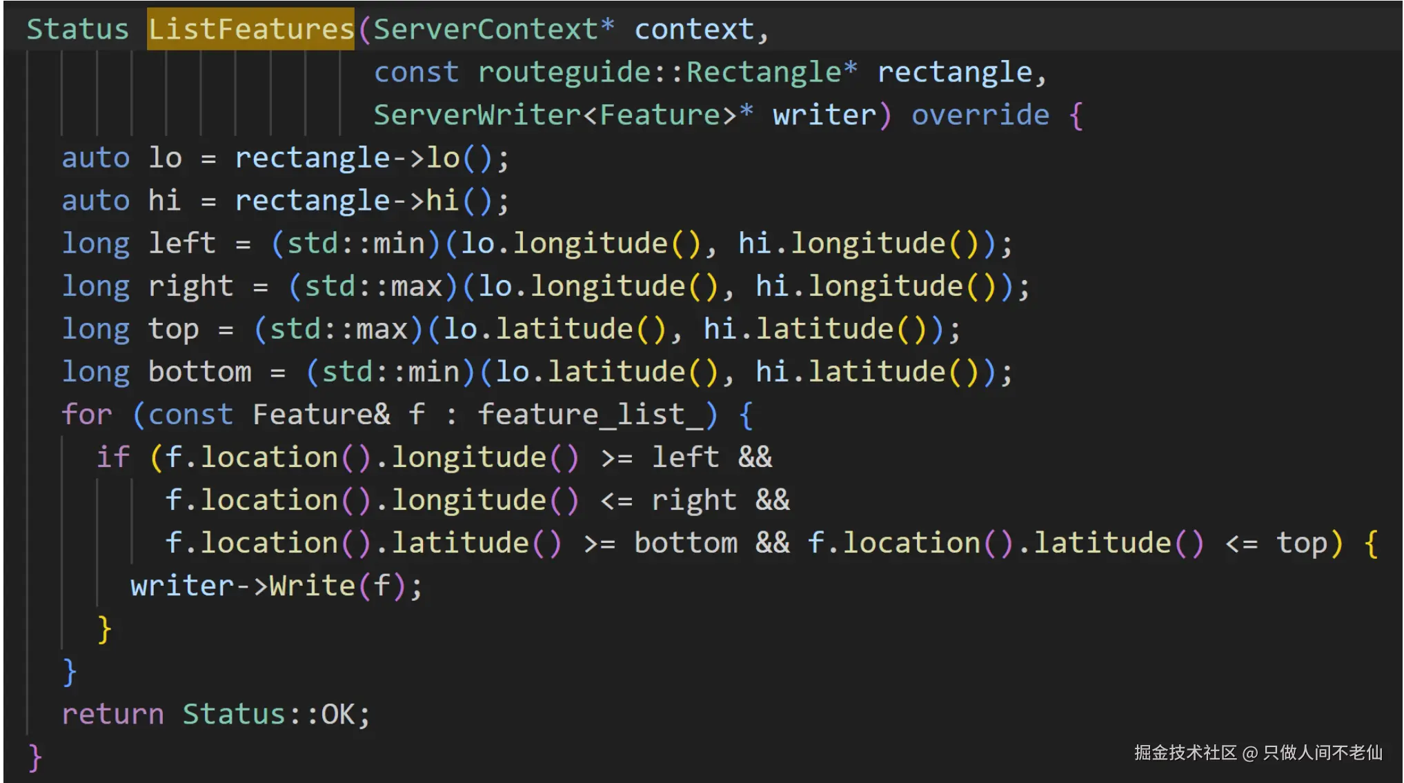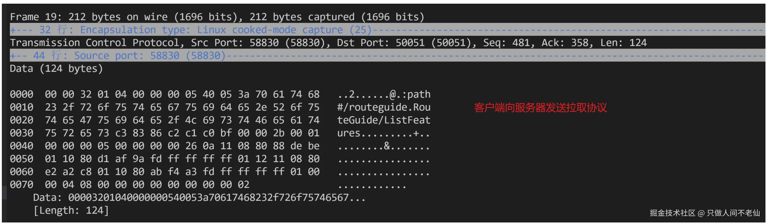 这个接口是客户端传给服务器一个矩形区域(用两个点表示),然后服务器返回给客户端在这个矩形区域范围内的所有点。与一元 RPC(Unary RPC)不同的是,服务器并不是将所有的点信息在一个消息包内一次性返回的,而是分多个包流式返回。这一点可以通过抓包来发现。抓包流程可以通过 抓包操作流程 一节得到。