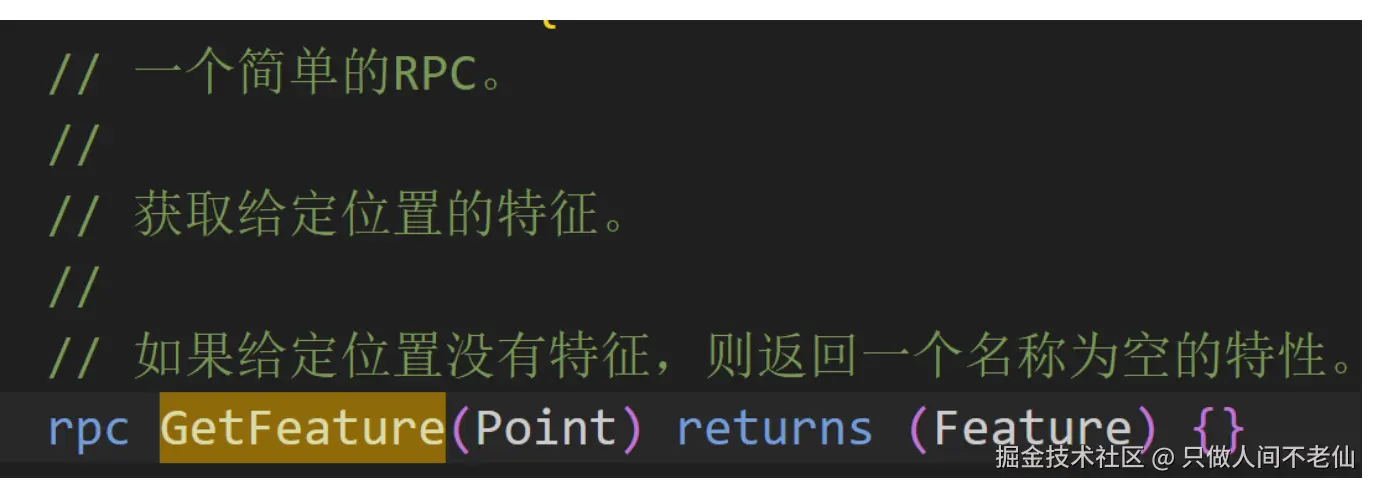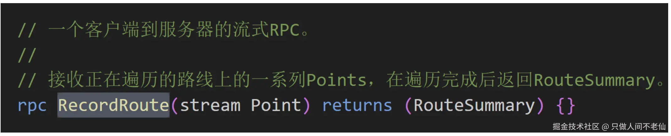 这个示例主要是为了展示grpc的四种rpc类型,即一元 RPC(Unary RPC)、服务器流式 RPC(Server streaming RPC)、客户端流式 RPC(Client streaming RPC)、双向流式 RPC(Bidirectional streaming RPC)。因此对代码的分析也分为这四种rpc类型来看。