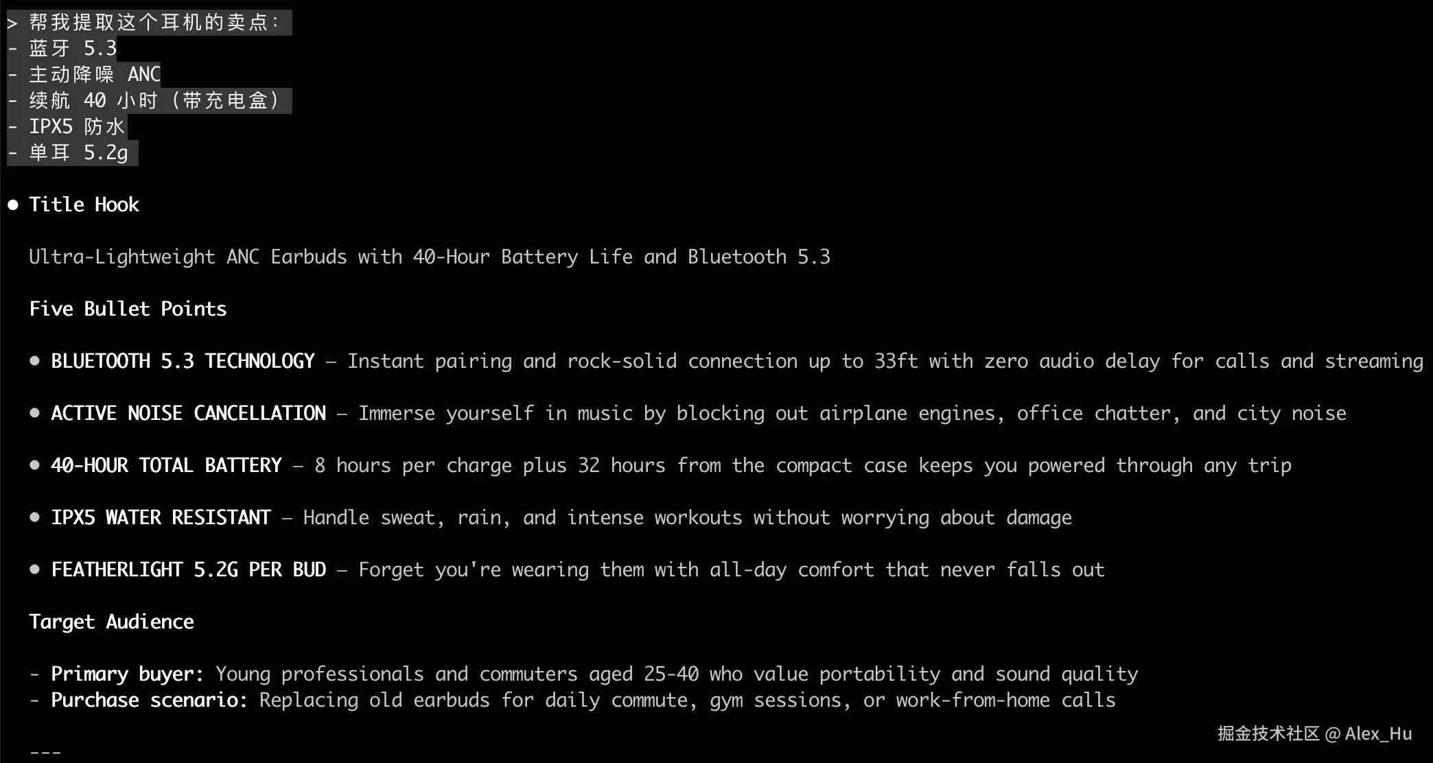 - 输出完整:我定义了标题卖点 + 五点描述 + 目标买家,Claude 每次都给齐,不会漏