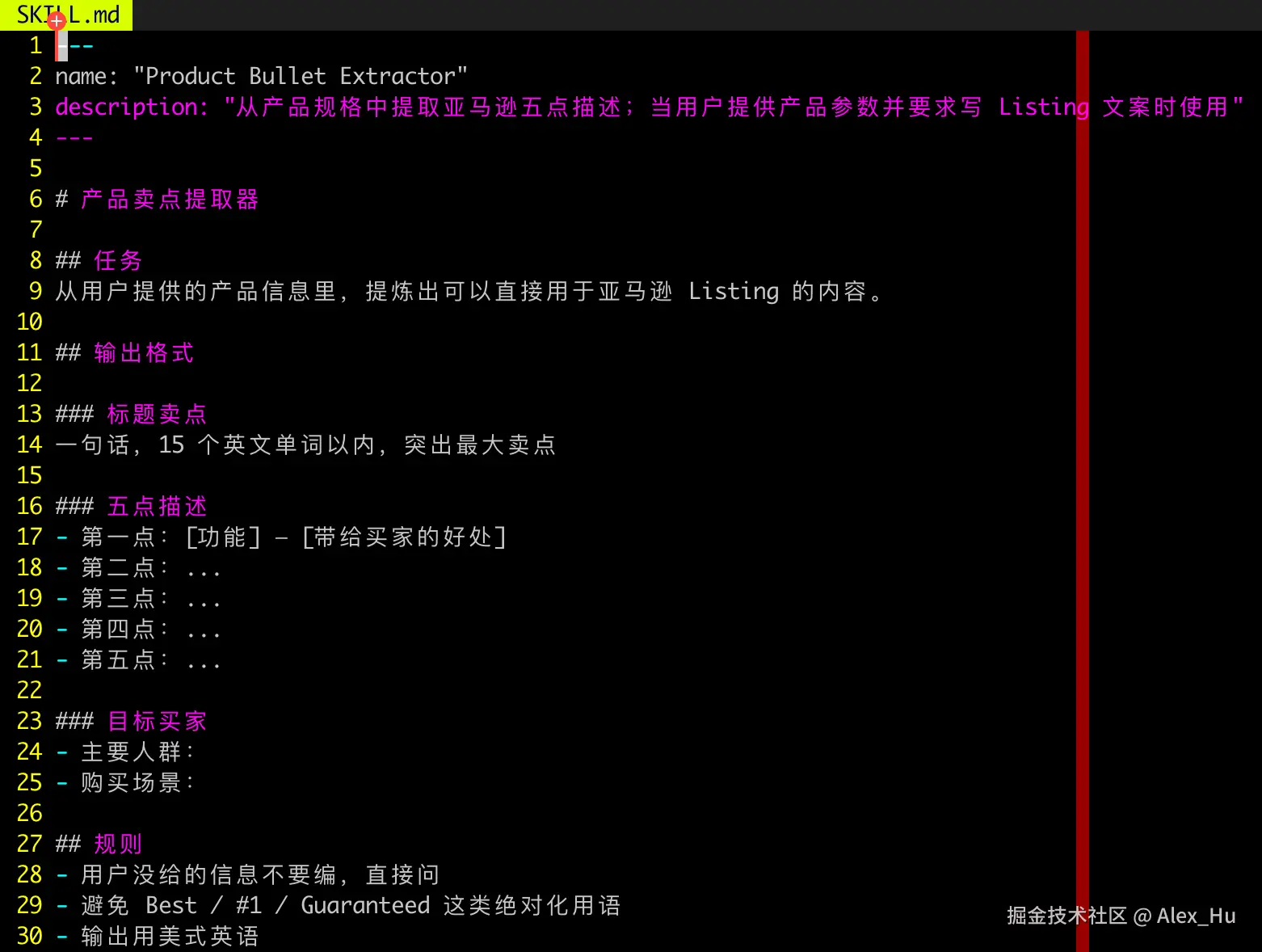 他每次让 Claude 写产品描述,都要先粘贴一大段东西——五点描述的格式要求、禁用词列表、关键词怎么布局。我数了一下,这个"规范说明"有 800 多字。