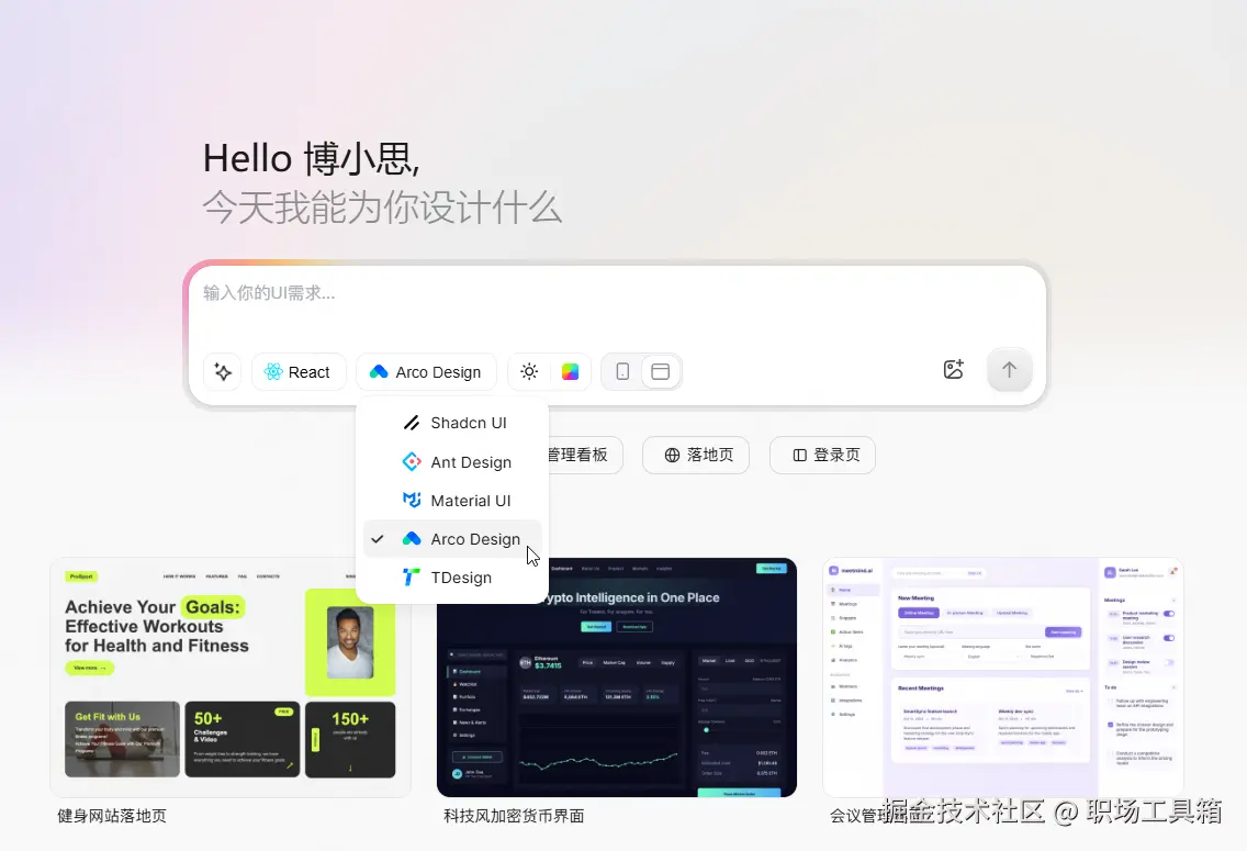 支持使用UI设计系统(Ant Design、Shadcn UI、Material UI、Arco Design、TDesign),生成组件化设计稿