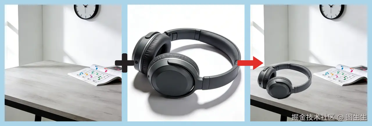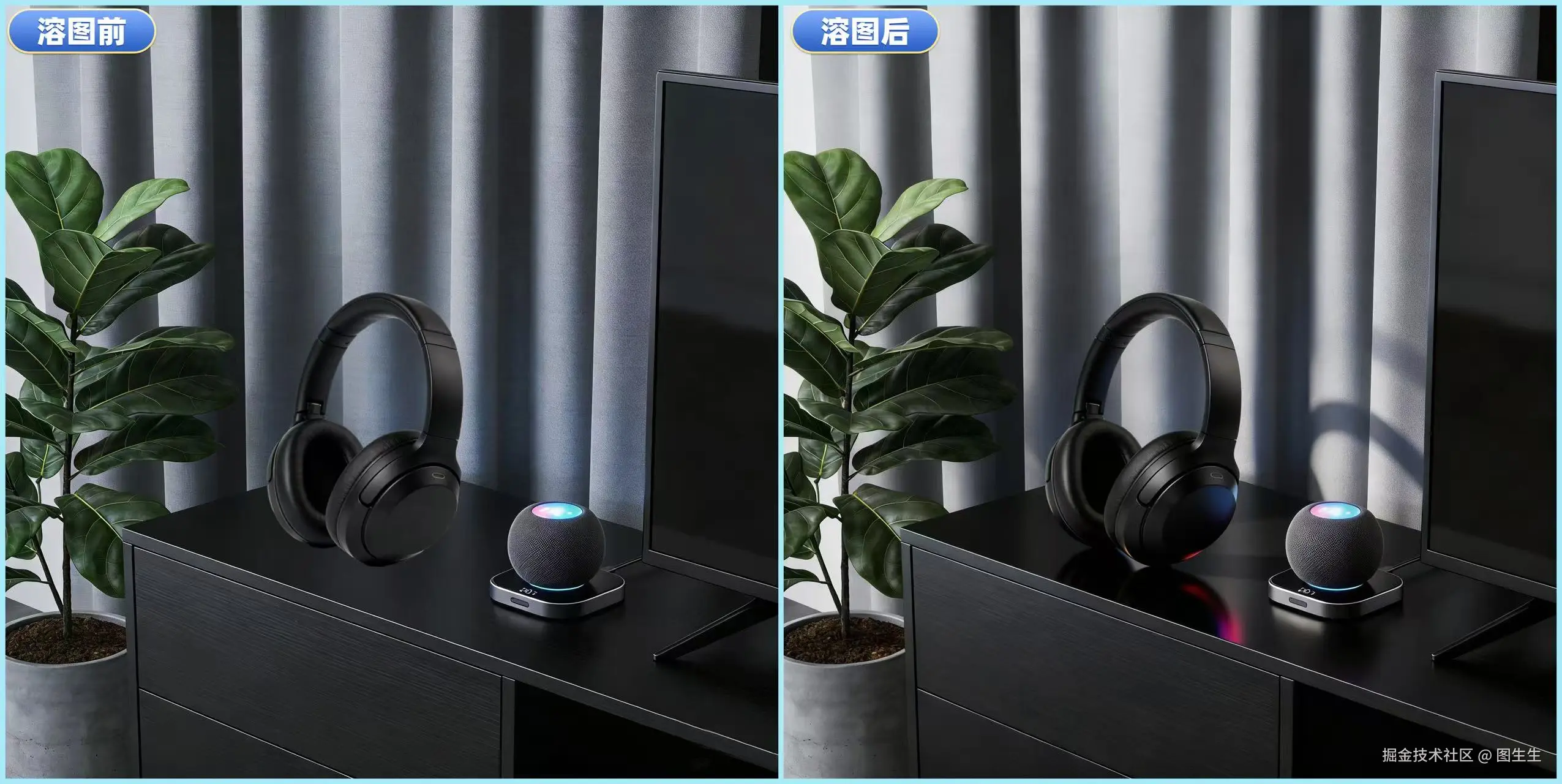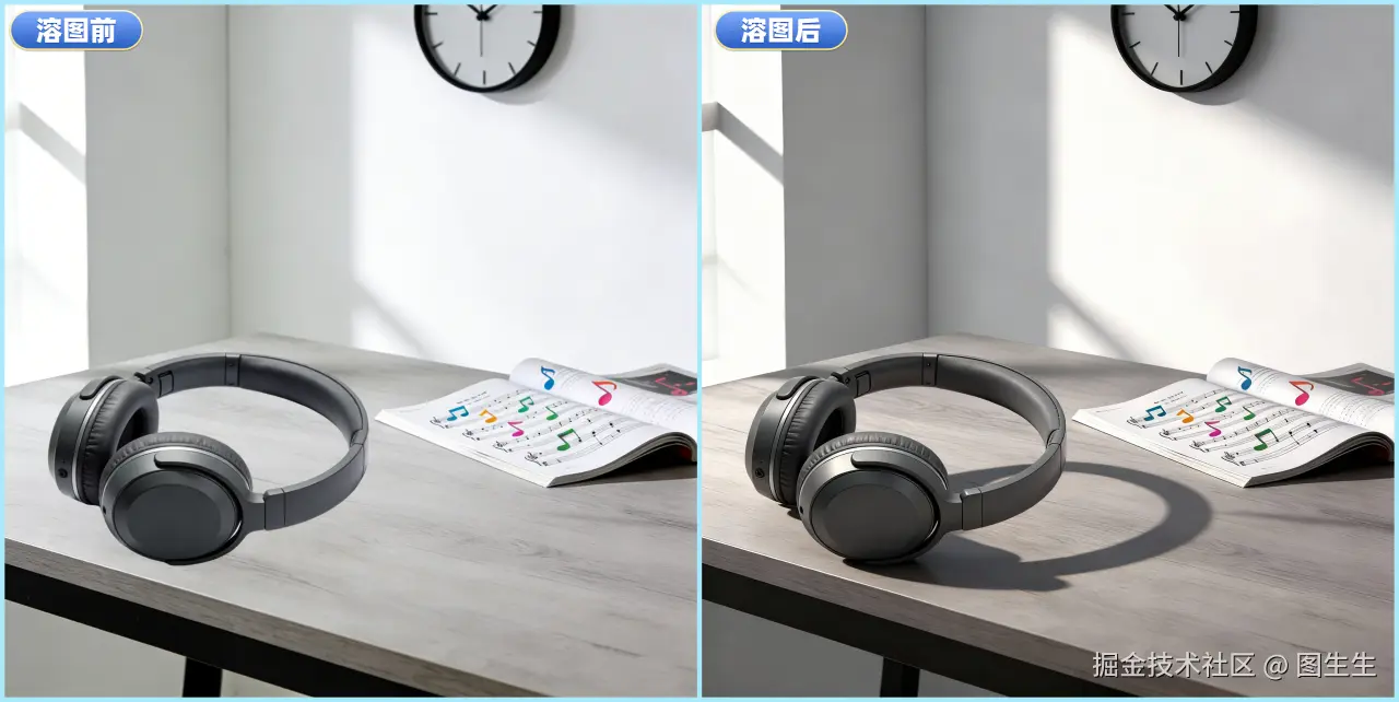 我们给耳机做“办公学习场景”详情页,抠图后将耳机贴在书桌场景里,发现光影脱节:耳机阴影是 “平面的”,和窗户斜向自然光完全不符,呈现 “悬浮感”;