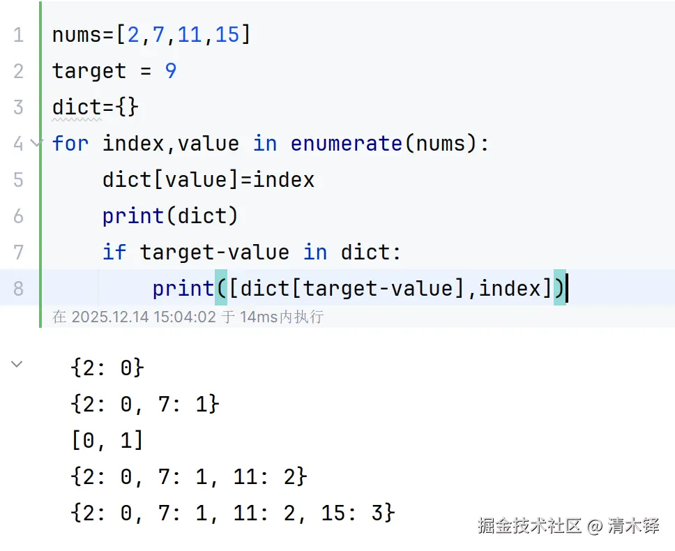 先遍历数组得到每个元素的index和value,存放到字典中 即构造一个字典,遍历字典的key每个数value(key),看target-value是否在同一个字典中,如果是就返回他们下标