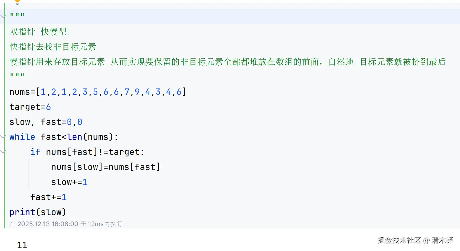 思想还是前移思想,暴力法是暴力覆盖,这里我们快指针主动去找不移除的元素去覆盖慢指针的位置,这样找完所有不移除的,要移除的自然而然就被推移到数组的最后,这时慢指针长度就是要返回的长度。这个方法是最快的。