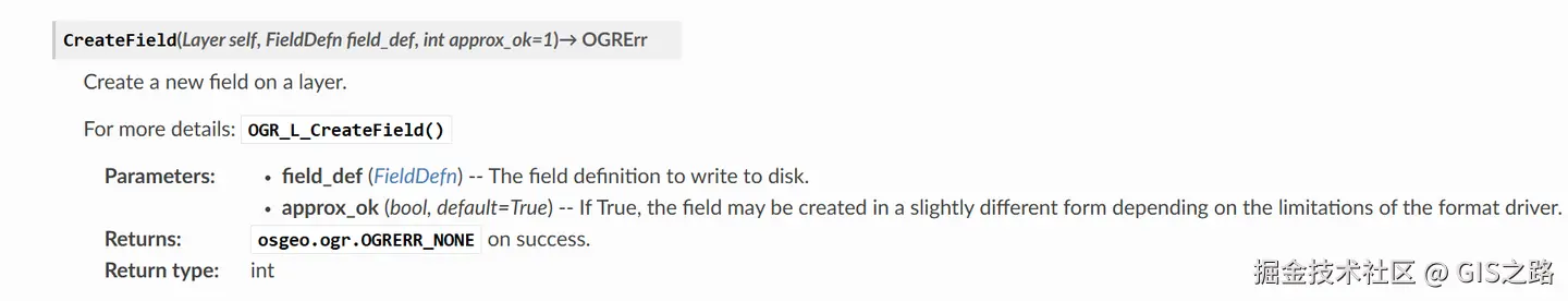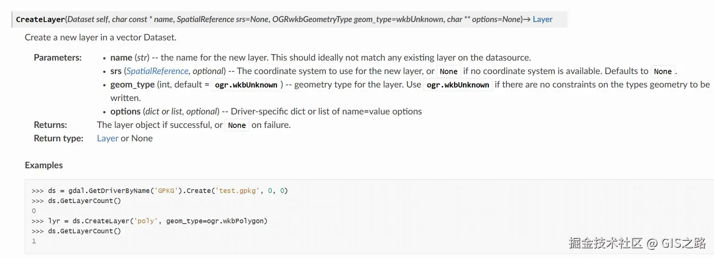 通过CreateLayer方法创建图层,该方法具有四个参数,图层名称、坐标系统以及几何类型是必传。