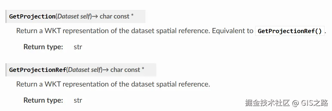 GetProjection和GetProjectionRef方法都可以用于读取坐标系统,两者都返回一个字符串类型WKT格式的数据集空间参考信息。