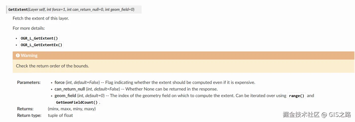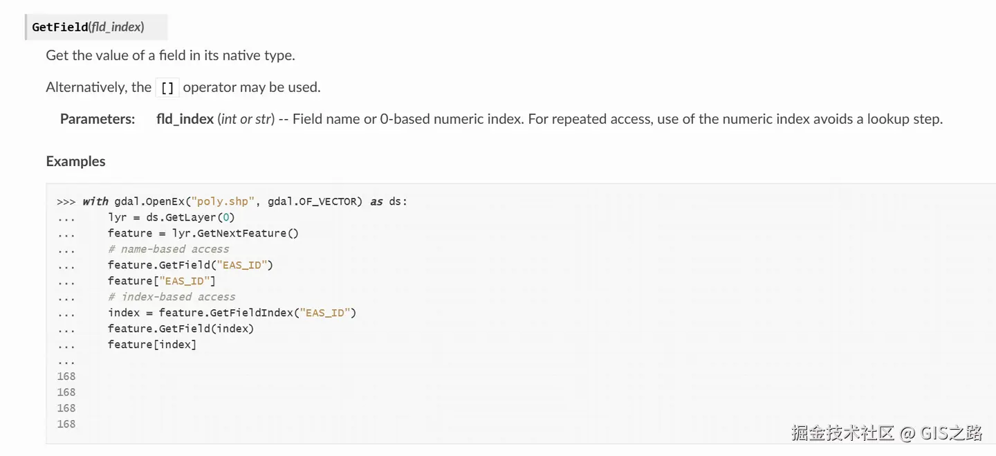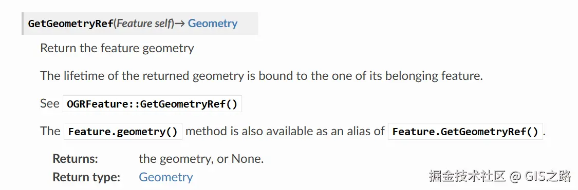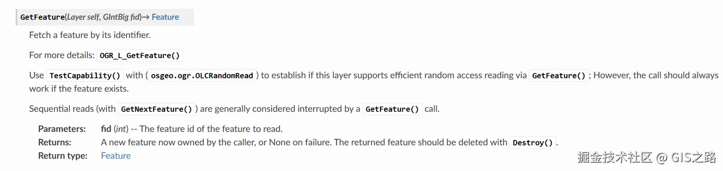 也可以通过GetNextFeature方法遍历要素特征,并且返回一个要素Feature。此方法适用于少数几个OGRLayer.GetNextFeature()效率不高的驱动程序,但总体而言,OGRLayer.GetNextFeature()是一个更自然的API。