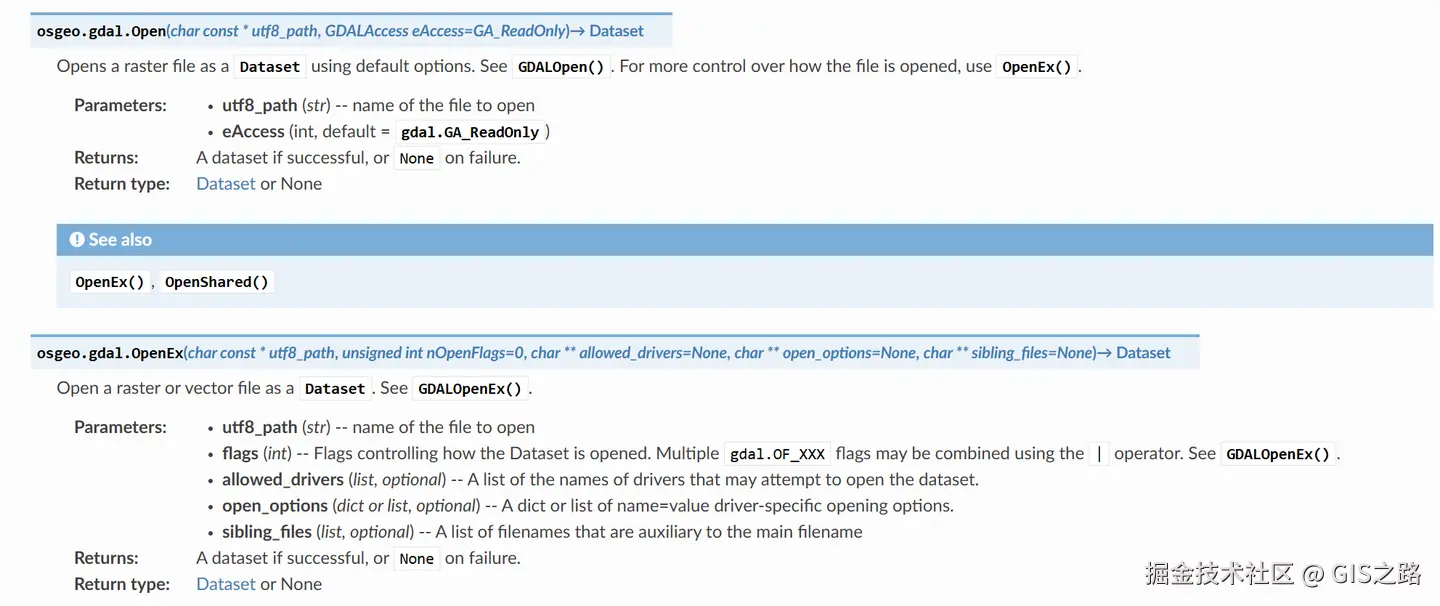 GDAL中可以使用Open方法直接打开数据源,进而读取图层数据。在GDAL Python API中,Driver和Dataset 类在Raster API文档中,既适用于矢量数据,也适用于栅格数据。