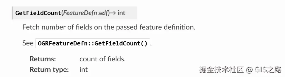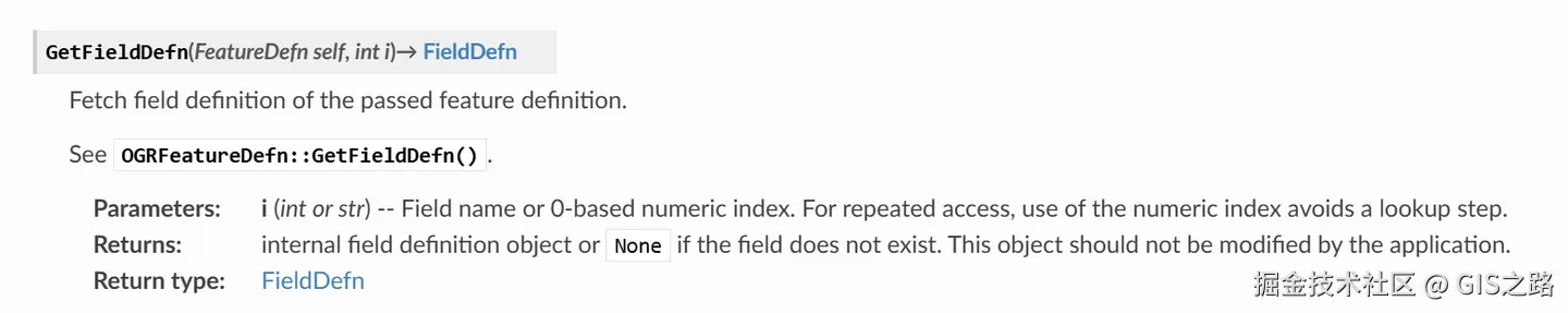 GetFieldDefn用于获取字段定义信息,其中包括字段名称,字段类型。