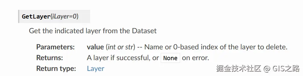 GDAL获取图层的常用方法为GetLayer,该方法只有一个参数。iLayer值固定为0,对shapefile图层来说是可选项。