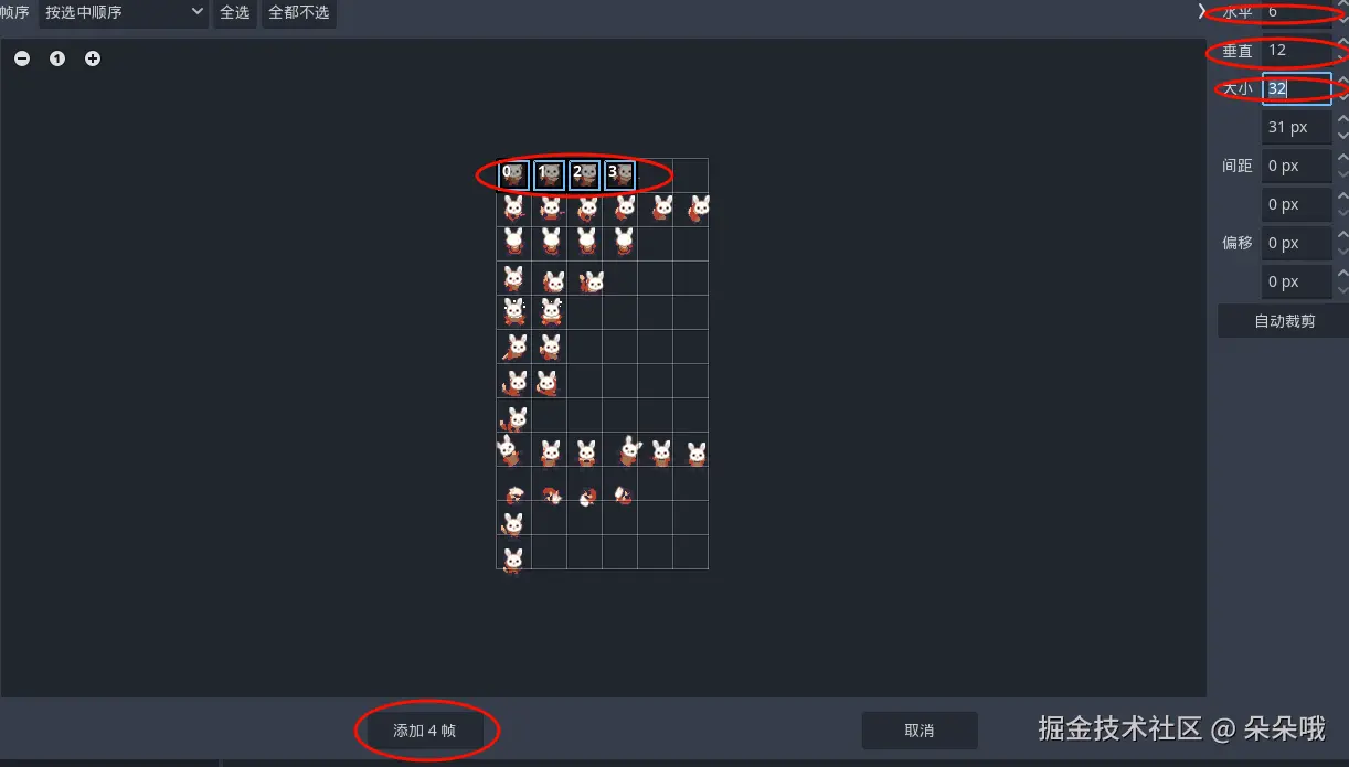水平6,垂直12,大小32,按顺序点击第一行的小狐狸,点击添加4帧.