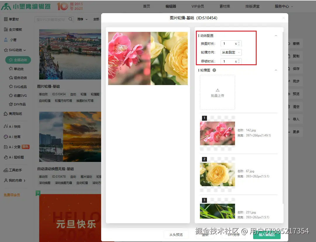 2、按需挑选喜欢的滑动动效(比如我选的动效 ID:s10454),直接点击就能一键写入编辑区;