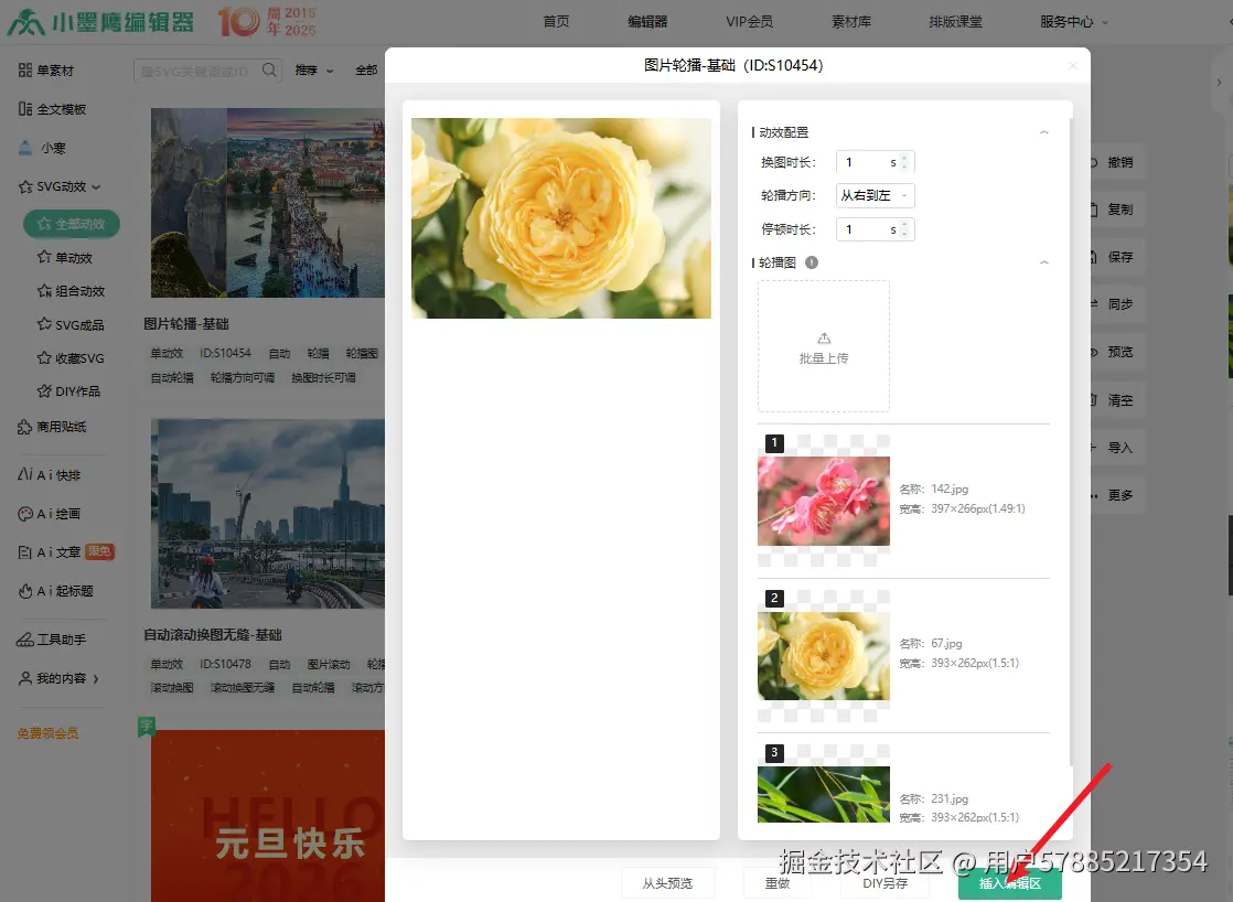 7、设置完成后,在左侧能实时看到预览效果,确认没问题就点击「插入编辑区」。