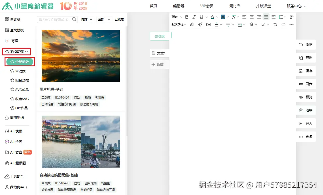1、打开小墨鹰编辑器,找到左侧菜单栏的「SVG 动效」,点击后选择「全部动效」,里面藏着各种实用的交互样式;