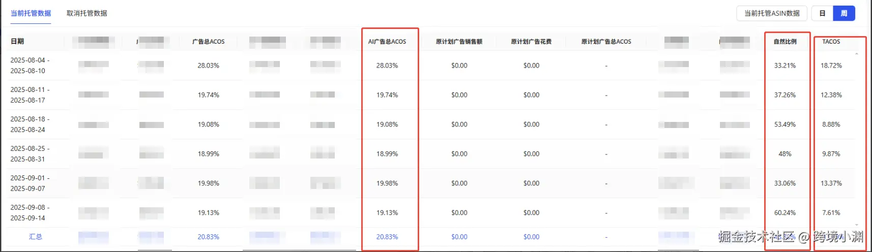 DeepBI托管后的周度数据表现里,核心亮点是ACOS稳降+自然流量占比提升: