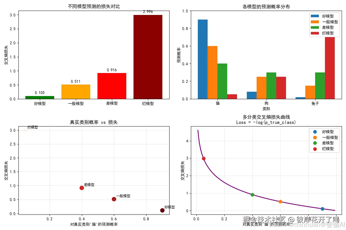 - 损失函数只看正确选项的概率是多少。如果正确选项的概率高,就给高分(低损失);如果正确选项的概率低,甚至错误选项的概率很高,就给低分(高损失)。