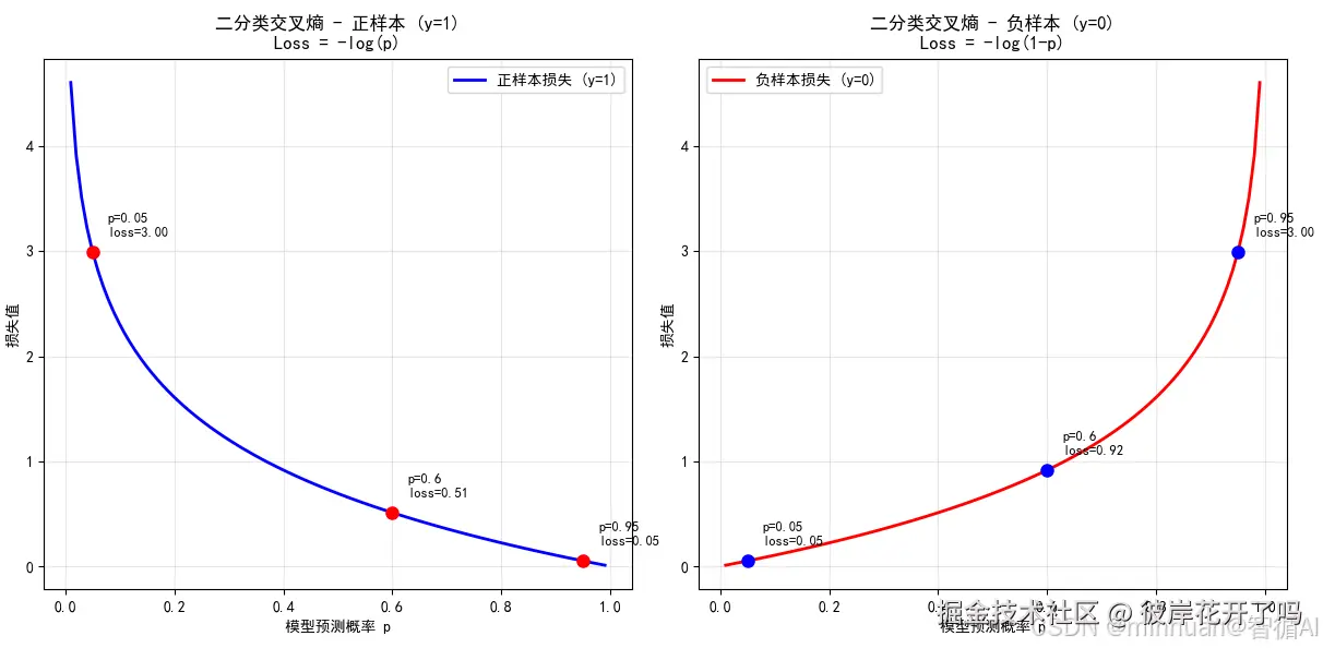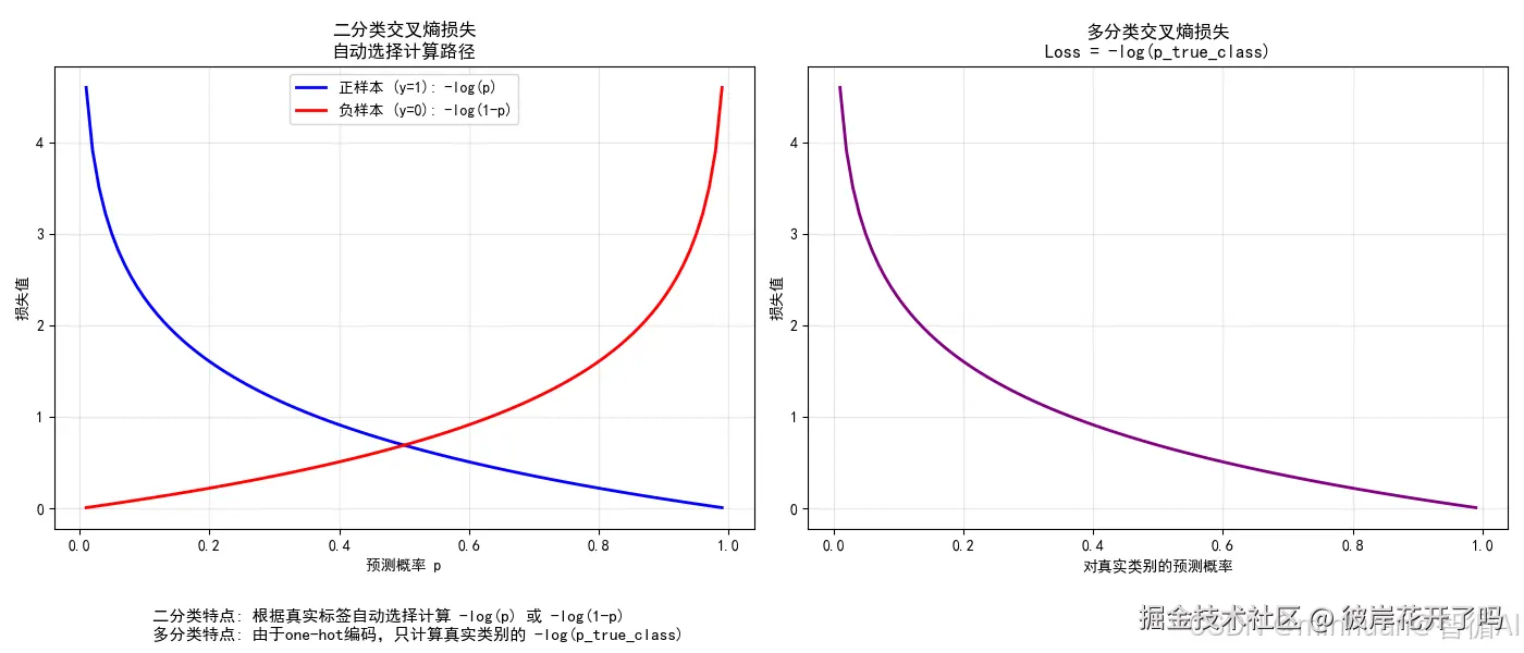 "二分类特点: 根据真实标签自动选择计算 -log(p) 或 -log(1-p)\n"